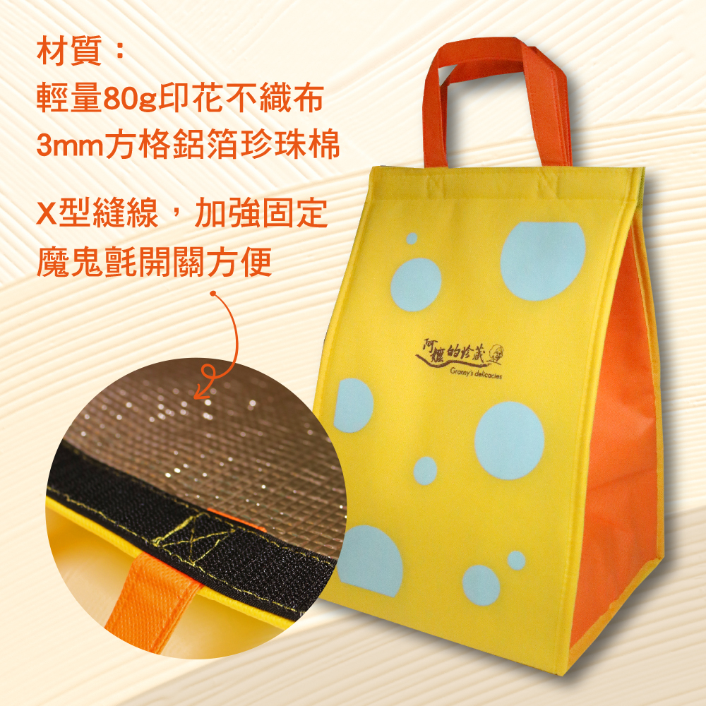 輕量80g印花不織布+3mm方格鋁箔珍珠棉材質,保冷/保溫效果佳!