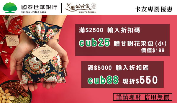 1.消費滿$2,500結帳時輸入折扣碼:「cub25」可獲得小甘謝花采包一個(價值$199),可累計。