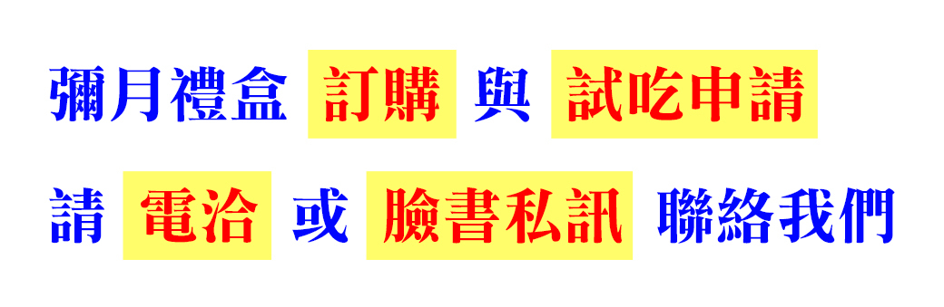 彌月禮盒訂購與試吃申請,請電洽06-2705520FB私訊 或 LINE一對一(ID: @line-mini-tart聯絡我們